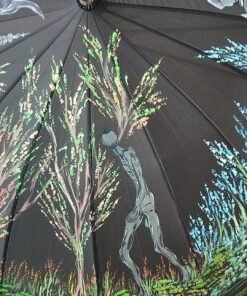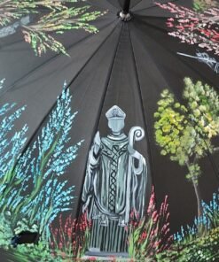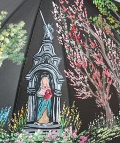 Como orgullosa vitoriana, he creado un paraguas que no solo protege de la lluvia, sino que también cuenta historias. Este paraguas pintado a mano sobre un fondo negro es un homenaje a mi ciudad: Vitoria-Gasteiz, conocida por su naturaleza exuberante y su rica historia. Cada pincelada refleja mi amor por los icónicos elementos que forman parte de nuestra identidad, plasmados en un paisaje donde el color verde reina con fuerza.